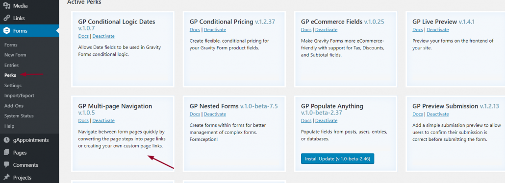 When you have a form with a lot of information, it can be intimidating to your user. By enabling multi page navigation you can break up the information into several pages and either navigate the user by progress bar or by pages. To begin, install Multi Page Navigation. Click on Forms, Perks and Choose Multipage Navigation. Activate.