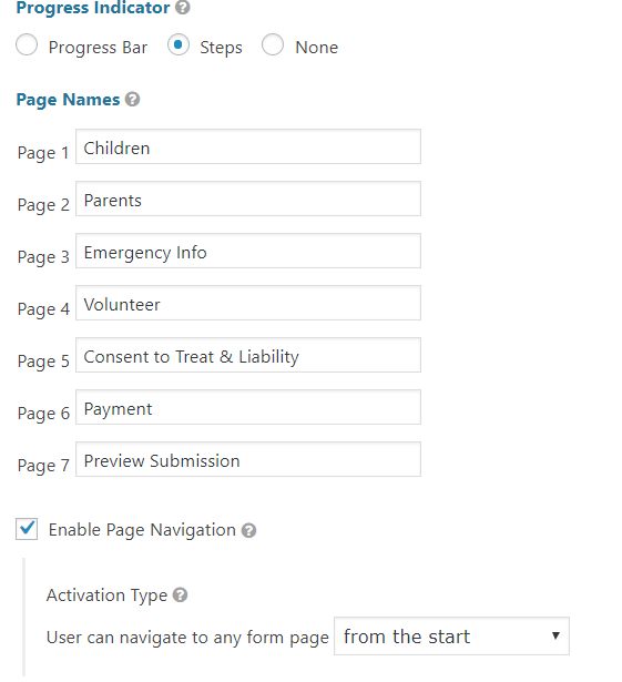 You can choose to navigate via progess bar or pages. If pages, the following screen will be shown and you can title the pages as you wish: